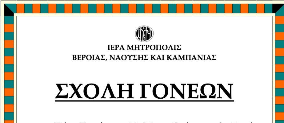 Τήν Τετάρτη 7 Δεκεμβρίου στίς 7 τό ἀπόγευμα στό Πνευματικό Κέντρο τῆς Ἱερᾶς μας Μητροπόλεως (Βενιζέλου 29, 1ος ὄροφος) ὁμιλήτρια στή Σχολή Γονέων θά εἶναι ἡ κ. Σοφία Μπουρδάνου, δικηγόρος, μέ θέμα: «Παιδί καί διαδίκτυο».