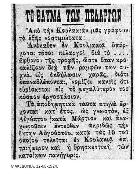 Τὰ ἀποδημητικὰ ταῦτα πτηνὰ ἔρχονται κατ᾿ ἔτος, ὡς γνωστόν, ἐξ Αἰγύπτου κατὰ Μάρτιον καὶ ἀναχωροῦσιν ἐντεῦθεν ἀκριβῶς τὴν ἕκτην Αὐγούστου, κατὰ τὰς 15 τοῦ ὁποίου τελεῖται ἐν Κουλακιᾷ ἐπὶ τριήμερον καὶ ἡ θρησκευτικὴ τῶν κατοίκων πανήγυρις.