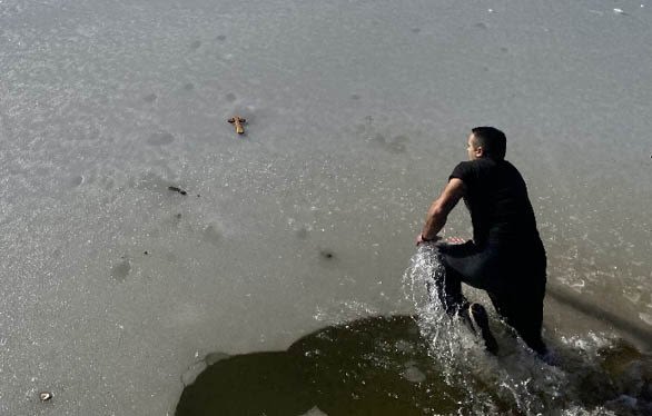 Τηρώντας παράδοση πολλών ετών, ο Ξηρολιβαδιώτης Στέφανος Πολιτίκος ανέσυρε και πάλι τον Σταυρό από την λίμνη, αψηφώντας τα παγωμένα νερά.