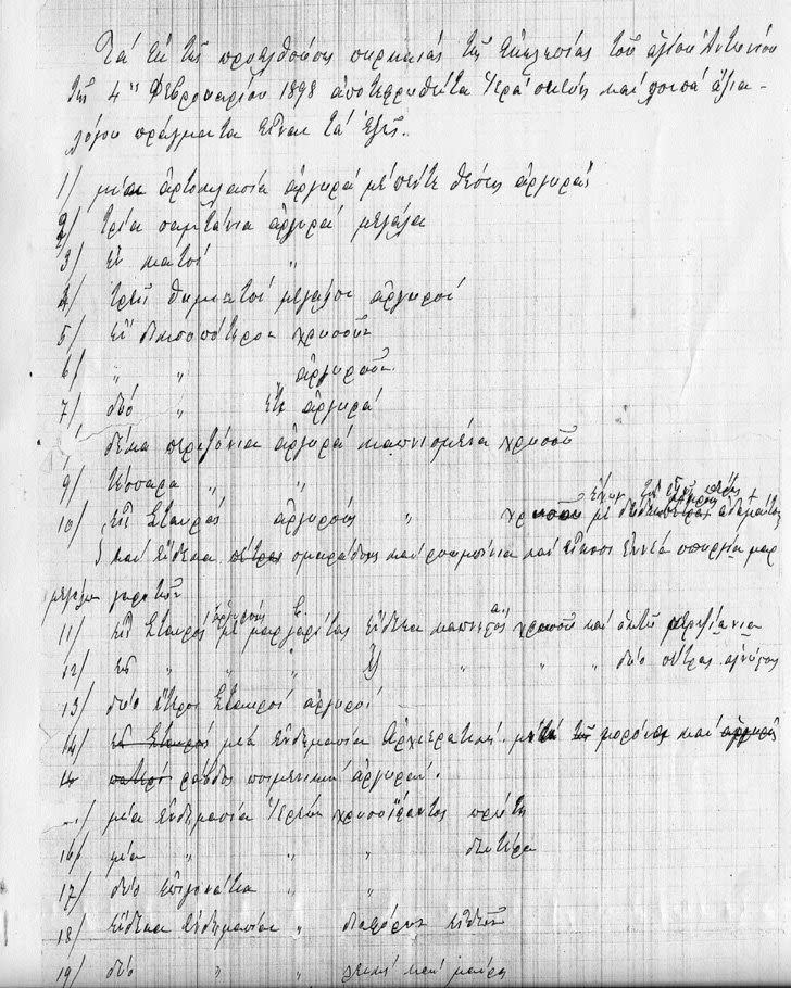 Στη διάρκεια της προσπάθειας αυτής, βρήκα λυτό έγγραφο που παρουσιάζει ενδιαφέρον γιατί καταγράφει τα ιερά σκεύη και τα άλλα πολύτιμα πράγματα που κάηκαν στην πυρκαϊά του ναού το 1898.