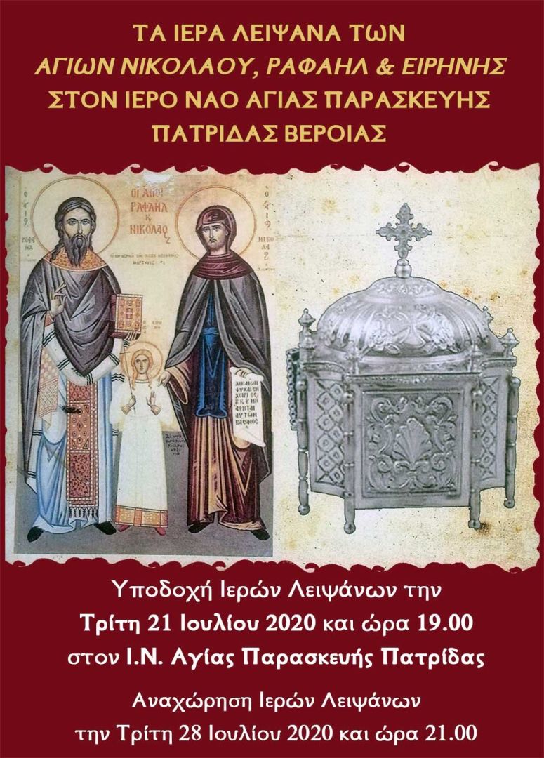 Τα λείψανα των Αγ. Ραφαήλ, Νικολάου και Ειρήνης στην Πατρίδα Βέροιας – Από 21 έως 28 Ιουλίου 2020