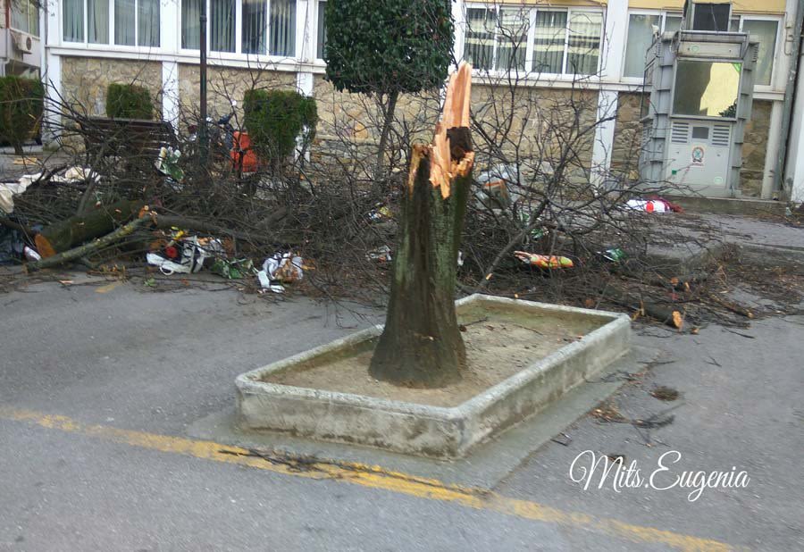 Έσπασαν δέντρα, κολώνες της ΔΕΗ, μεγάλα κομμάτια λαμαρίνων μέχρι και 6 μέτρα «ταξίδευαν» από σκεπή σε σκεπή σπάζοντας ηλιακά και προσγειώνονταν σε μπαλκόνια σπιτιών, τέντες ξηλώθηκαν, έπεφταν κεραμίδια, πινακίδες, ακόμα και σιδερένια τραπέζια από μπαλκόνια, κεραίες από ταράτσες, ενώ η ένταση του ανέμου έσπασε μέχρι και χοντρές τζαμαρίες καταστημάτων, στην περιφερειακή Νάουσας- Βέροιας, αλλά και σιδερένιες περιφράξεις που τις ξήλωσε κυριολεκτικά. Μεγάλες περιοχές έμειναν χωρίς ηλεκτρικό ρεύμα.