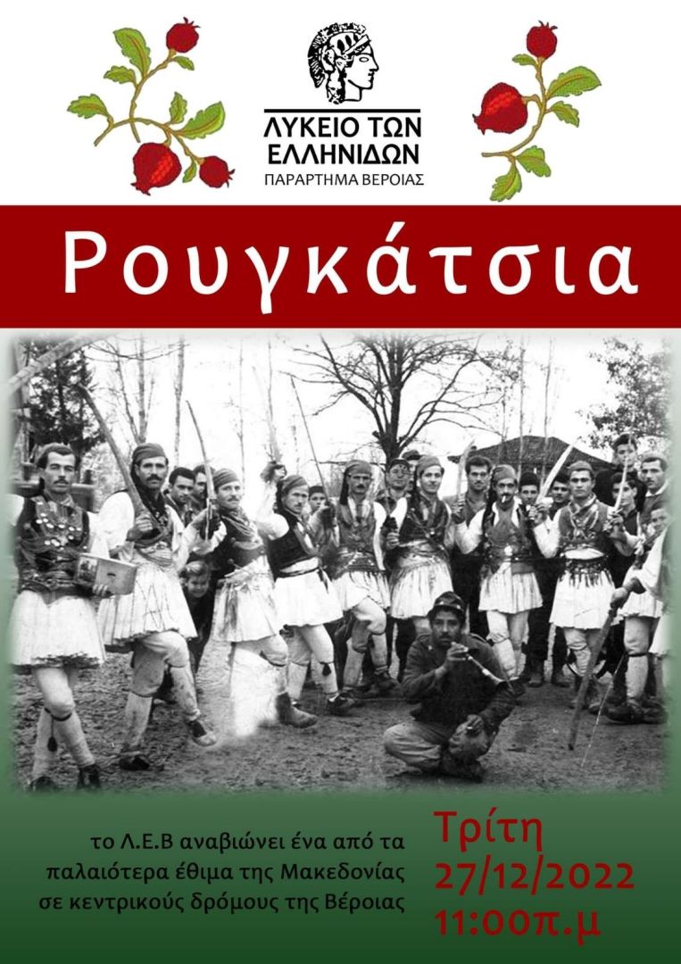 Ένα από τα παλαιότερα έθιμα της Μακεδονίας, τα Ρουγκάτσια θα αναβιώσουμε ως Λύκειο των Ελληνίδων Βέροιας την Τρίτη 27 Δεκεμβρίου σε κεντρικούς δρόμους της Βέροιας συνοδεία ζουρναδων.