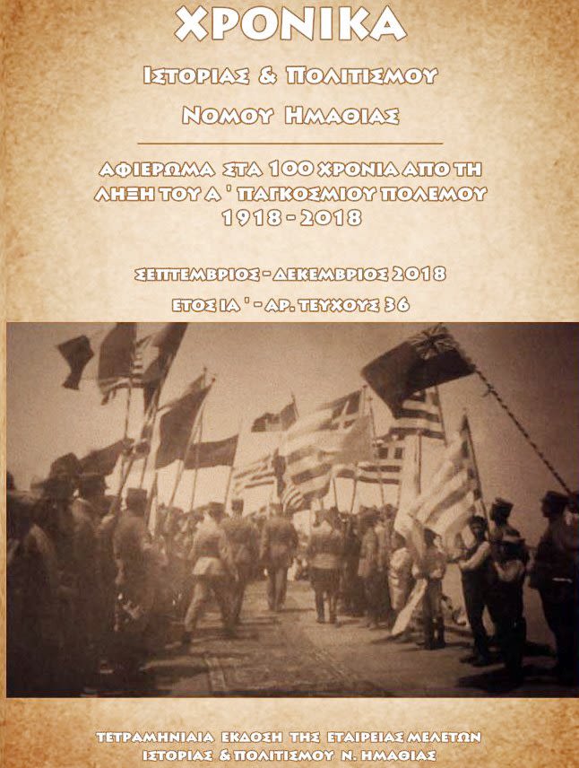 Έτοιμο και το 36ο τεύχος των «Χρονικών Ιστορίας και Πολιτισμού Ν. Ημαθίας» για τον Α΄ Παγκόσμιο Πόλεμο στην Ημαθία. Πρόκειται για μία ακόμη έκδοση της Ε.Μ.Ι.Π.Η., ένα αφιερωματικό τεύχος, με αφορμή τη συμπλήρωση 100 χρόνων από τη λήξη του πολέμου.