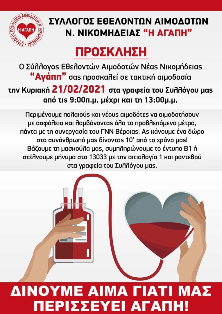 Ο Σύλλογος Εθελοντών Αιμοδοτών Νέας Νικομήδειας ” Η ΑΓΑΠΗ” καλεί τα μέλη του στην πρώτη τακτική αιμοδοσία για το 2021. Την Κυριακή 21 Φεβρουαρίου από τις 9.00 έως τη 13.00 σας περιμένουμε όλους στα γραφεία του Συλλόγου στη Νέα Νικομήδεια. Τώρα που περνάμε μια δύσκολη περίοδο, τώρα που οι ανάγκες για αίμα είναι μεγαλύτερες από πότε η συμμετοχή όλων μας κρίνεται απαραίτητη.