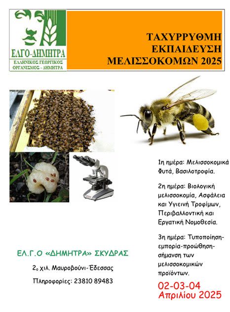 2η ημέρα (3-4-2025): Βιολογική μελισσοκομία (όροι και προϋποθέσεις). Εθνική και ενωσιακή νομοθεσία για την ασφάλεια και υγιεινή στα τρόφιμα, περιβαλλοντική νομοθεσία και την εργατική νομοθεσία.