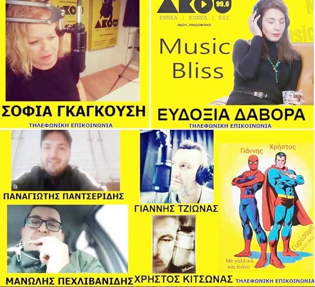 Η μουσικοθεραπεύτρια Εύη Δαβόρα (Μusic Bliss) έδωσε τις δικές της ευχές…αλλά και συμβουλές-tips για να αισθανθείτε ευτυχισμένοι, ενώ το δίδυμο των υπερηρώων Χρήστος Κιτσώνας (Σούπερμαν) και Γιάννης Τζιώνας (Σπάιντερμαν) ευχήθηκαν με Γαλλικά…και πιάνο στους ακροατές που τους έλειψε η μοναδική ραδιοφωνική τρέλα της ψυχαγωγικής εκπομπής τους.