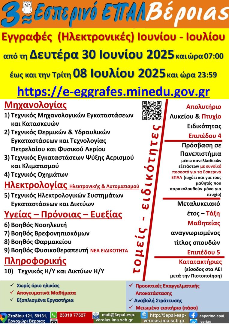 Τελευταίες Ημέρες Εγγραφών (Ηλεκτρονικών) στο 3ο Εσπερινό ΕΠΑΛ Βέροιας