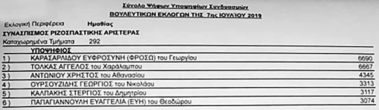 Μετά την ανακήρυξη των οριστικών αποτελεσμάτων από το Πρωτοδικείο Βέροιας, που είναι και τα επίσημα μετά τον έλεγχο και τις επανακαταμετρήσεις, δεν άλλαξε κάτι στα πρόσωπα που καταλαμβάνουν τις έδρες, ωστόσο η διαφορά μεταξύ των δύο πρώτων υποψηφίων του ΣΥΡΙΖΑ, Φρόσως Καρασαρλίδου με 6.690 και Άγγελου Τόλκα με 6.667, είναι οριακή, αφού είναι μόλις 23 ψήφοι, κι όχι 92 που μετρήθηκαν αρχικά. Πραγματικά είναι αξιοσημείωτο σε έναν εκλογικό αγώνα, που οι δύο υποψήφιοι «όργωσαν» το νομό και συνάντησαν χιλιάδες ψηφοφόρους, μόλις 23 ψήφοι διαφορά έκριναν το αποτέλεσμα.