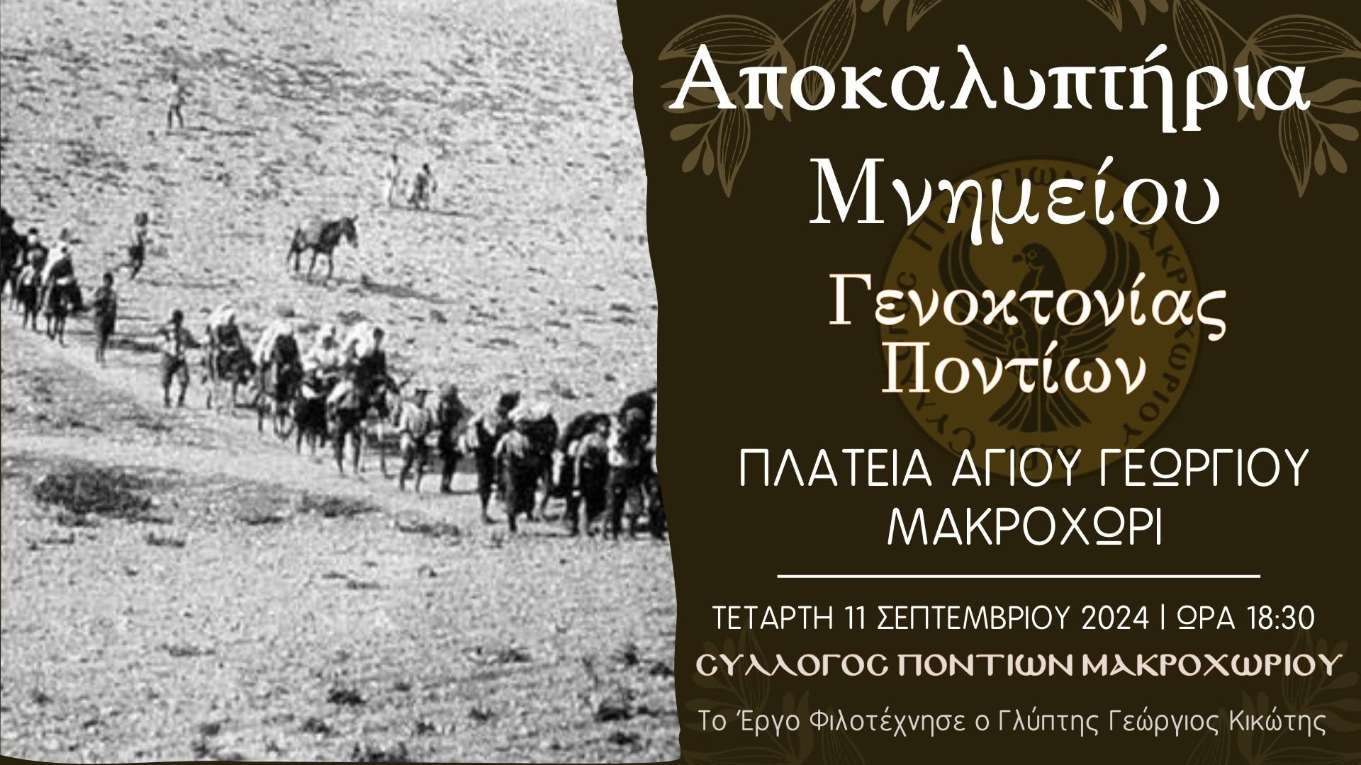 Την Τετάρτη 11 Σεπτεμβρίου 2024 στην πλατεία Αγίου Γεωργίου στο Μακροχώρι στις 6.30 μ.μ. θα πραγματοποιηθεί εκδήλωση τιμής και μνήμης με τα Αποκαλυπτήρια Μνημείου Γενοκτονίας των Ποντίων. Το έργο φιλοτέχνησε ο γλύπτης Γεώργιος Κικώτης.