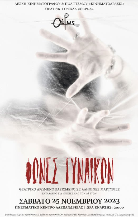 Η Θεατρική Ομάδα «Θέρως» της Λέσχης Κινηματογράφου και Πολιτισμού Κινηματόδρασις , παρουσιάζει το Θεατρικό Δρώμενο “ΦΩΝΕΣ ΓΥΝΑΙΚΩΝ” στο Πνευματικό Κέντρο Αλεξάνδρειας το Σάββατο 25 Νοεμβρίου 2023, στις 8:00 μ.μ.