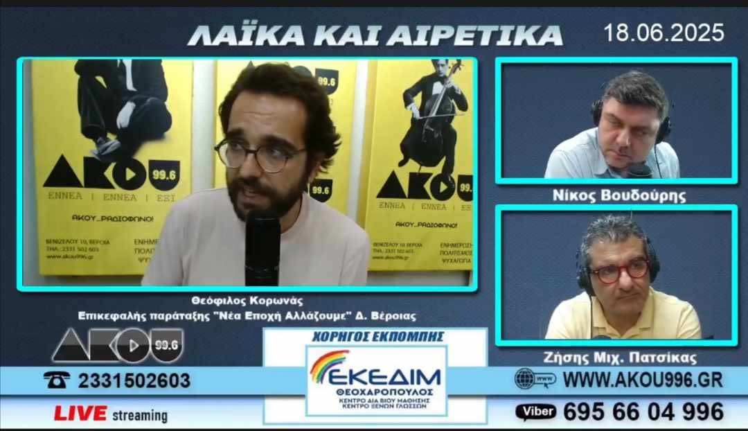 Μια ενδιαφέρουσα εφ’ όλης της ύλης ζωντανή ραδιοφωνική συνέντευξη έδωσε το μεσημέρι της Τετάρτης(18/6/2025) στον ΑΚΟΥ 99.6 και την εκπομπή «Λαϊκά&Αιρετικά», ο Θεόφιλος Κορωνάς, επικεφαλής της παράταξης «Νέα Εποχή-ΑλλάΖουμε» στο δήμο Βέροιας. Ο κ. Κορωνάς ερωτήθηκε από τους Ζήση Μιχ. Πατσίκα και Νίκο Βουδούρη για θέματα και προβλήματα του δήμου όπως οι παιδικές χαρές, ο βιολογικός, η ΚΕΠΑ και οι πολιτιστικές εκδηλώσεις, το νέο κλειστό γυμναστήριο που εξαγγέλθηκε και γενικότερα οι αθλητικοί χώροι, ενώ επανήλθε και έθεσε τις προτάσεις της παράταξής του για την στήριξη των κακοποιημένων γυναικών με πρόγραμμα εργασίας από τον δήμο και το μεταπτυχιακό πρόγραμμα σπουδών για τον Απόστολο Παύλο σε συνεργασία με την Θεολογική Σχολή του Α.Π.Θ. που έχουν κάνει προεργασία, αλλά δυστυχώς όπως ανέφερε ο κ. Κορωνάς, ο δήμαρχος δεν έχει καν απαντήσει στην πρότασή τους.