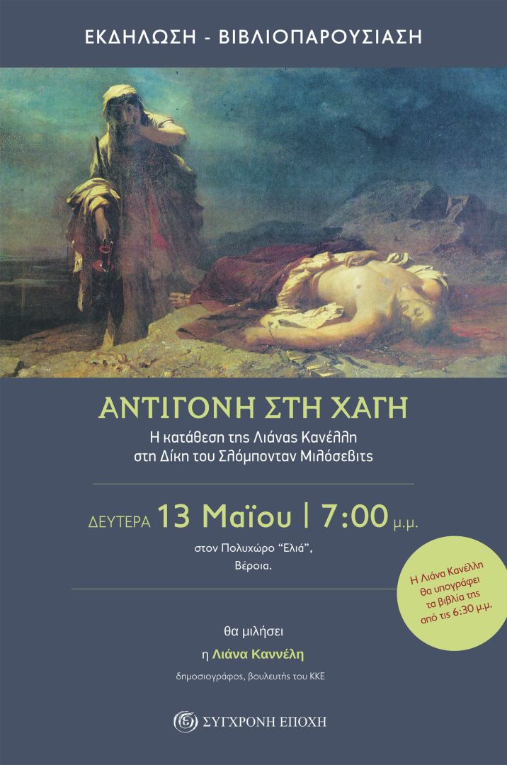 Με αφορμή την επίσκεψή της, η ΚΟ Ημαθίας του ΚΚΕ διοργανώνει εκδήλωση-βιβλιοπαρουσίαση της νέας έκδοσης της Σύγχρονης Εποχής «ΑΝΤΙΓΟΝΗ ΣΤΗ ΧΑΓΗ – Η ΚΑΤΑΘΕΣΗ ΤΗΣ ΛΙΑΝΑΣ ΚΑΝΕΛΛΗ ΣΤΗ ΔΙΚΗ ΤΟΥ ΣΛ. ΜΙΛΟΣΕΒΙΤΣ» την Δευτέρα 13 Μαίου 2024. Η παρουσίαση του βιβλίου από την ίδια θα ξεκινήσει στις 7 το απόγευμα στον πολυχώρο της Ελιάς στη Βέροια. Όπως σημειώνεται στην ανακοίνωση της εκδήλωσης, «είκοσι πέντε χρόνια μετά από τον πόλεμο και τη ΝΑΤΟϊκή επέμβαση στη Γιουγκοσλαβία και είκοσι χρόνια μετά από τη δίκη του Σλόμπονταν Μιλόσεβιτς, η για πρώτη φορά απόδοση και δημοσίευση στα ελληνικά, ολόκληρης της κατάθεσης της Λιάνας Κανέλλη σε αυτή, έχει αποδέκτες όλους εκείνους που δεν ξέχασαν και όλους εκείνους που δεν ξέρουν και αναζητούν να μάθουν την αλήθεια. Όσους πάλεψαν και συνεχίζουν να παλεύουν για την ειρήνη μέσα από το δρόμο της αντιπαράθεσης με τον καπιταλισμό, που κυοφορεί και γεννά τον πόλεμο. Η παρούσα έκδοση, προσφέρει μια καλή αλλά εξαιρετικά πικρή γεύση τι σημαίνει ιμπεριαλιστικό δίκαιο, Διεθνές Ποινικό Δικαστήριο, Δικαστήριο της Χάγης. Κατά πόσο και για ποιον προσφέρουν “δικαιοσύνη” επιλύουν ζητήματα και από ποια σκοπιά».