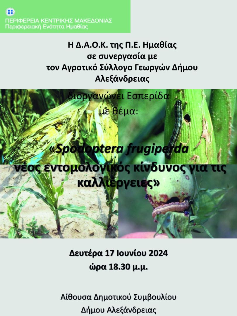 Η Διεύθυνση Αγροτικής Οικονομίας και Κτηνιατρικής της Περιφερειακής Ενότητας Ημαθίας σε συνεργασία με τον Αγροτικό Σύλλογο Γεωργών Δήμου Αλεξάνδρειας διοργανώνει εσπερίδα με θέμα: «spodoptera frugiperda νέος εντομολογικός κίνδυνος για τις καλλιέργειες».