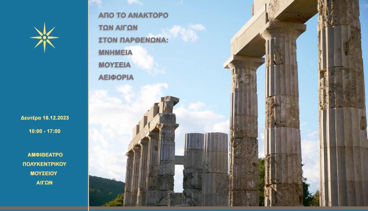 Ημερίδα με τίτλο «Από το Ανάκτορο των Αιγών στον Παρθενώνα» θα πραγματοποιηθεί την Δευτέρα 18 Δεκεμβρίου 2023, 10:00-17:00, στο Αμφιθέατρο του Πολυκεντρικού Μουσείου Αιγών.