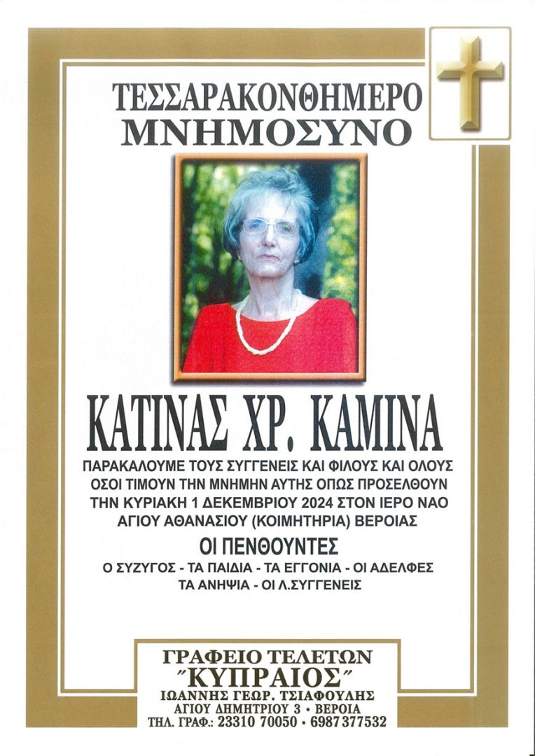 Τελείται την Κυριακή 1 Δεκεμβρίου 2024 στον Ιερό Ναό Αγίου Αθανασίου (Κοιμητήρια) Βέροιας 40ΝΘΗΜΕΡΟ ΜΝΗΜΟΣΥΝΟ για την ανάπαυση της ψυχής της πολυαγαπημένης μας συζύγου, μητέρας, γιαγιάς, αδελφής και θείας ΚΑΤΙΝΑΣ ΧΡ. ΚΑΜΙΝΑ και καλούμε όλους όσοι τιμούν τη μνήμη της να προσέλθουν και να ενώσουν μαζί μας τις δεήσεις τους προς το Θεό.
