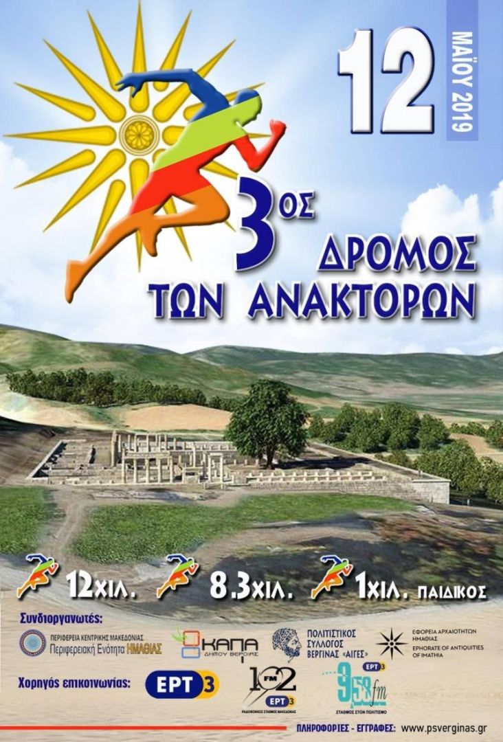 Την Κυριακή 12 Μαΐου 2019 ο Πολιτιστικός Σύλλογος Βεργίνας «ΑΙΓΕΣ», η Π.Ε. Ημαθίας, το ΚΑΠΑ του Δήμου Βέροιας και η Εφορεία Αρχαιοτήτων Ημαθίας, σας προσκαλούν στον 3ο Δρόμο των Ανακτόρων που διεξάγεται για τρίτη συνεχή χρονιά στη Βεργίνα, τις αρχαίες Αιγές, τον τόπο που διάλεξαν οι Μακεδόνες για να ιδρύσουν την πρωτεύουσά τους και εκεί όπου ο Φίλιππος Β΄ έχτισε το λαμπρό του ανάκτορο.