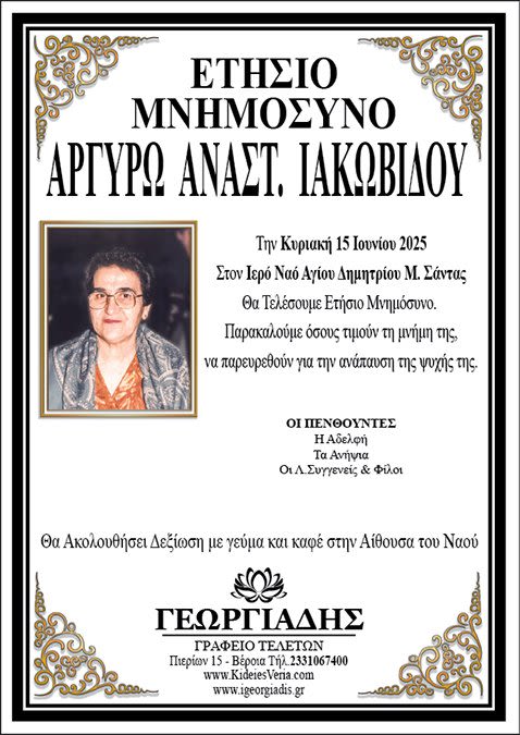 Τελείται την Κυριακή 15 Ιουνίου 2025 στον Ιερό Ναό Αγίου Δημητρίου Μ. Σάντας ΕΤΗΣΙΟ ΜΝΗΜΟΣΥΝΟ για την ανάπαυση της ψυχής της αγαπημένου μας αδελφής και θείας ΑΡΓΥΡΩΣ ΑΝΑΣΤ. ΙΑΚΩΒΙΔΟΥ και καλούμε όλους όσοι τιμούν τη μνήμη της να προσέλθουν και να ενώσουν μαζί μας τις δεήσεις τους προς το Θεό.