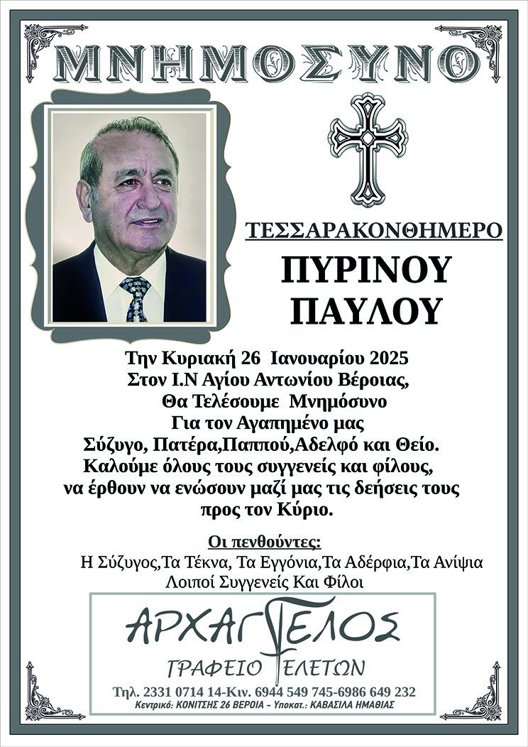 Τελούμε την Κυριακή 26 Ιανουαρίου 2025 στον Ιερό Ναό Αγίου Αντωνίου Βέροιας 40ΝΘΗΜΕΡΟ ΜΝΗΜΟΣΥΝΟ για την ανάπαυση της ψυχής του αγαπημένου μας συζύγου, πατέρα, παππού, αδελφού και θείου