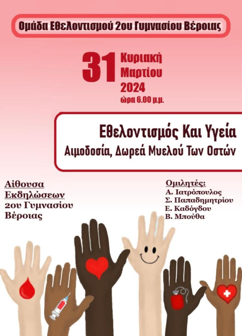 Η Ομάδα Εθελοντών του 2ου Γυμνασίου Βέροιας διοργανώνει ενημερωτική εκδήλωση για την Εθελοντική Αιμοδοσία και τη Δωρεά Μυελού των Οστών.