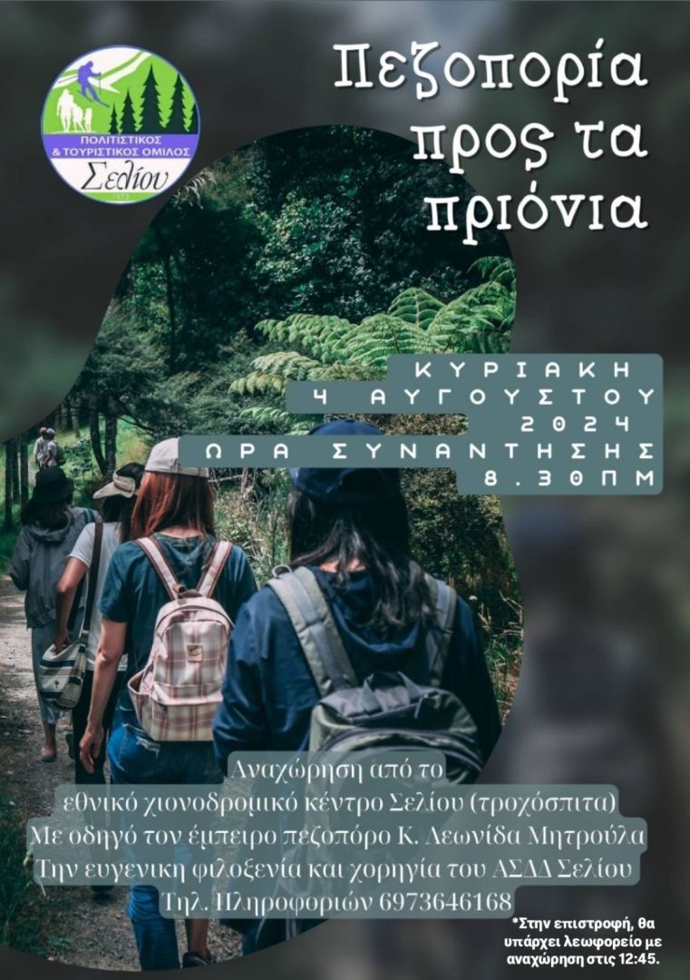 Την Κυριακή 4 Αυγούστου θα πραγματοποιηθεί η καθιερωμένη πεζοπορία προς την τοποθεσία “Πριόνια”, υπό την συνοδεία του έμπειρου πεζοπόρου κ. Λεωνίδα Μητρούλα, με σημείο εκκίνησης το parking του Εθνικού Χιονοδρομικού Κέντρου Σελίου . Οι ενδιαφερόμενοι θα πρέπει να βρίσκονται στο χώρο συνάντησης στις 8:30 πμ για την σχετική ενημέρωση καθώς θα τηρηθεί με ακρίβεια η ώρα εκκίνησης στις 8:45 πμ.