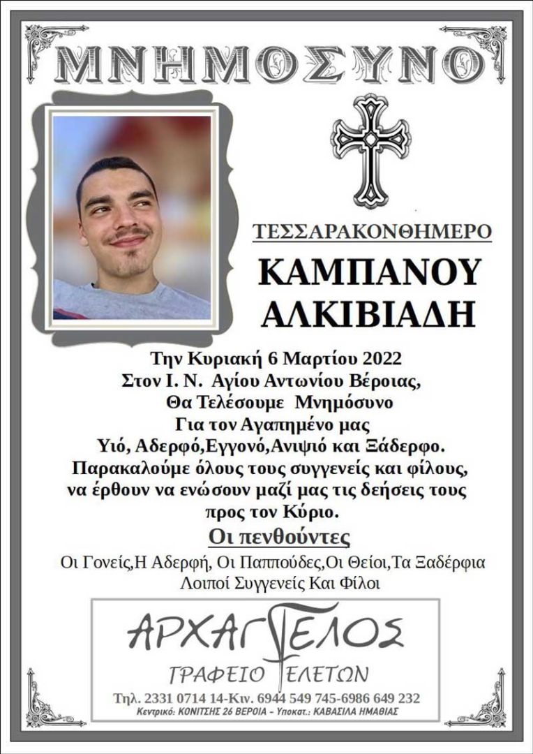 Την Κυριακή 6 Μαρτίου 2022, στο Ναό Αγ. Αντωνίου Βέροιας, θα τελεστεί το 40ημερο μνημόσυνο του αδικοχαμένου 19χρονου Άλκη Καμπανού, που δολοφονήθηκε την 1η Φεβρουαρίου 2022 στην περιοχή Χαριλάου της Θεσσαλονίκης.