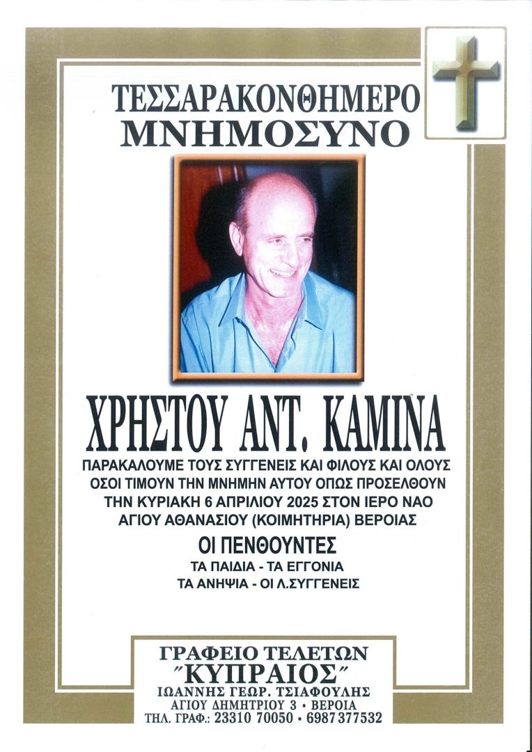 Τελείται την Κυριακή 6 Απριλίου 2025 στον Ιερό Ναό Αγίου Αθανασίου Βέροιας  40ΝΘΗΜΕΡΟ ΜΝΗΜΟΣΥΝΟ για την ανάπαυση της ψυχής του αγαπημένου μας πατέρα, παππού και θείου ΧΡΗΣΤΟΥ ΑΝΤ. ΚΑΜΙΝΑ και καλούμε όλους όσοι τιμούν τη μνήμη του να προσέλθουν και να ενώσουν μαζί μας τις δεήσεις τους προς το Θεό.