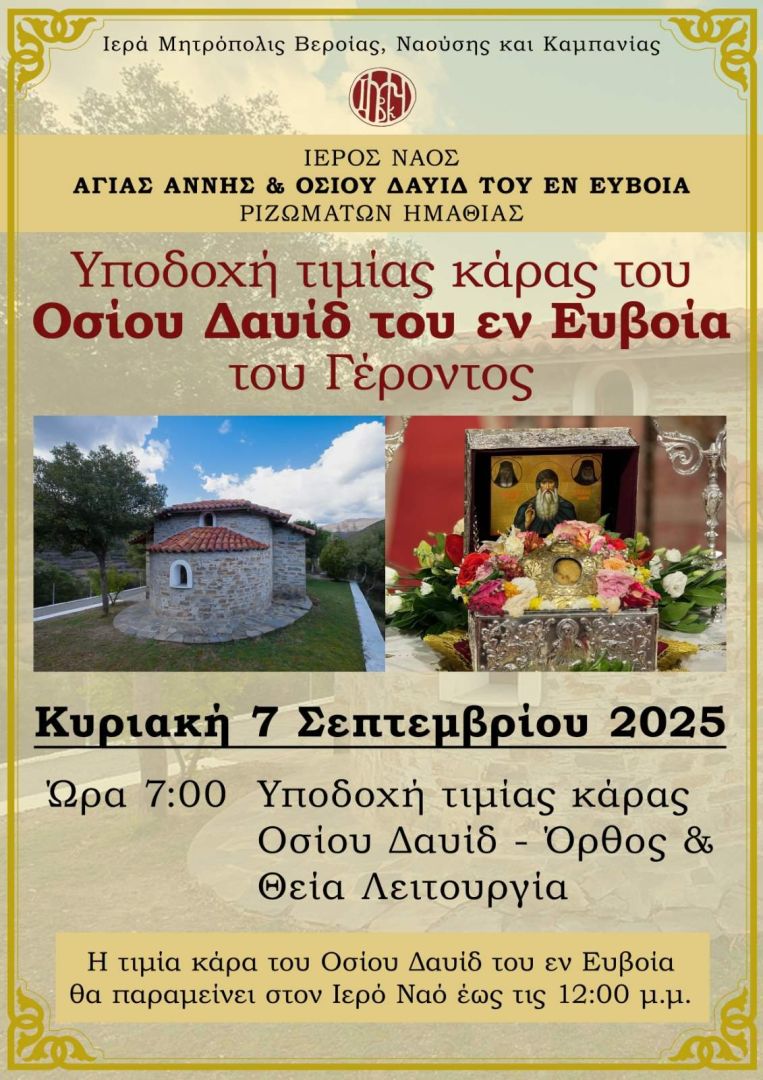 Ο Ιερός Ναός Αγίας Άννης και Οσίου Δαυίδ του εν Ευβοία Ριζωμάτων Ημαθίας θα υποδεχθεί την τιμία κάρα του Οσίου Δαυίδ του εν Ευβοία του Γέροντος με το εξής πρόγραμμα: