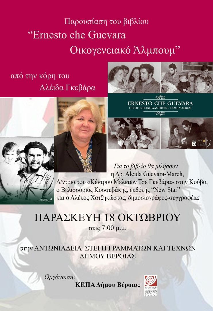 Την Βέροια θα επισκεφθεί την Παρασκευή 18 Οκτωβρίου, η κόρη του Τσε Γκεβάρα, Αλέιδα Γκεβάρα , όπου θα παρουσιάσει στην Στέγη Γραμμάτων και Τεχνών, στις 7:00 μ.μ. το βιβλίο “Ernesto che Guevara, Οικογενειακό Άλμπουμ” που κυκλοφορεί από τις εκδόσεις New Star. Για το βιβλίο θα μιλήσουν η Δρ. Aleida Guevara-March, Δ/ντρια του «Κέντρου Μελετών Τσε Γκεβάρα» στην Κούβα, ο Βελισσάριος Κοσσυβάκης, εκδότης “New Star” και ο Αλέκος Χατζηκώστας, δημοσιογράφος-συγγραφέας. Διοργάνωση: ΚΕΠΑ Βέροιας.