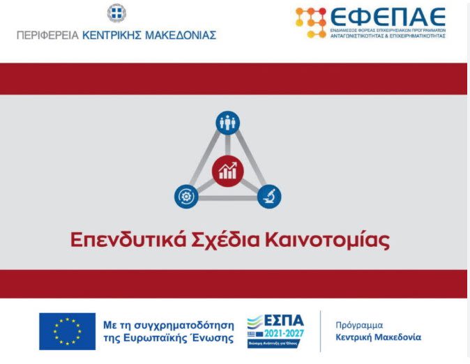 Η Δράση συγχρηματοδοτείται από Ευρωπαϊκό Ταμείο Περιφερειακής Ανάπτυξης (ΕΤΠΑ) της Ευρωπαϊκής Ένωσης με χρήση της κοινής στήριξης (άρθρο 25 ΚΑΝ ΕΕ 1060/2021 για τη χρηματοδότηση παρεμβάσεων που εμπίπτουν στο πεδίο ενισχύσεων του ΕΚΤ+ και Εθνικούς Πόρους στο πλαίσιο του Προγράμματος “Κεντρικής Μακεδονία” του ΕΣΠΑ 2021-2027.