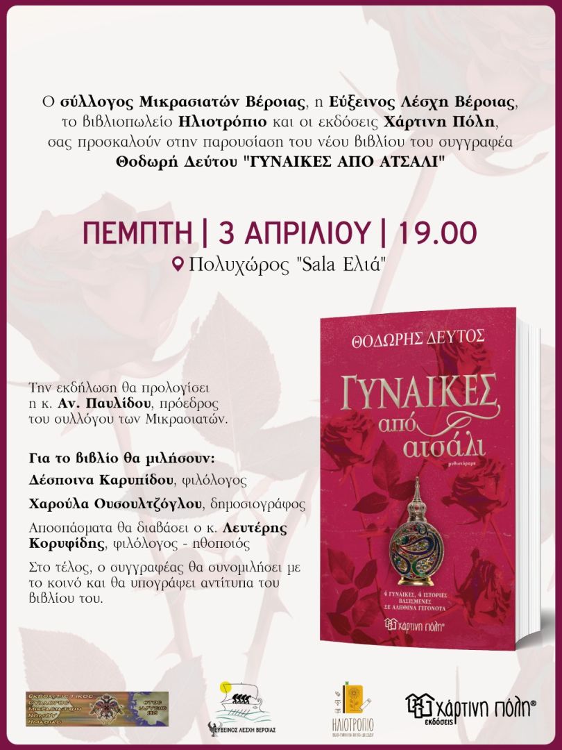 Ο Σύλλογος Μικρασιατών Βέροιας, η Εύξεινος Λέσχη Βέροιας, το βιβλιοπωλείο Ηλιοτρόπιο και οι εκδόσεις Χάρτινη Πόλη, παρουσιάζουν το νέο βιβλίο του συγγραφέα Θοδωρή Δεύτου “ΓΥΝΑΙΚΕΣ ΑΠΟ ΑΤΣΑΛΙ” την Πέμπτη 3 Απριλίου στις 7.00 μ.μ. στον πολυχώρο “Sala Ελιά”.