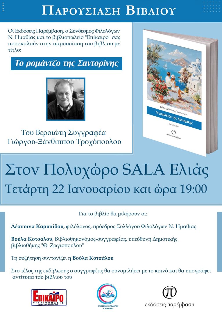 Οι Εκδόσεις Παρέμβαση, ο Σύνδεσμος Φιλολόγων Ν. Ημαθίας και το βιβλιοπωλείο «Επίκαιρο» θα πραγματοποιήσουν την παρουσίαση του νέου βιβλίου του Βεροιώτη συγγραφέα Γιώργου-Ξάνθιππου Τροχόπουλου, με τίτλο «Το ρομάντζο της Σαντορίνης». Η εκδήλωση θα πραγματοποιηθεί την Τετάρτη, 22 Ιανουαρίου, στις 19:00, στον Πολυχώρο SALA Ελιάς.