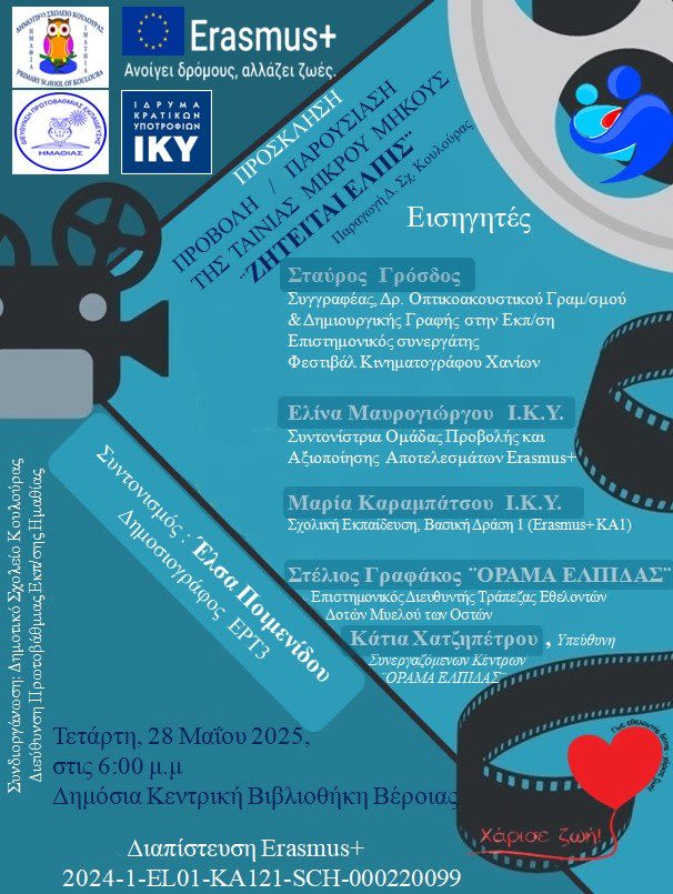 Στα πλαίσια διάδοσης και διάχυσης των αποτελεσμάτων της Διαπίστευσης Erasmus+ παρουσιάζεται στη Δημόσια Κεντρική Βιβλιοθήκη της Βέροιας, την Τετάρτη 28 Μαΐου 2025, στις 18:00 μ.μ. η ταινία μικρού μήκους του Δημοτικού Σχολείου Κουλούρας, ̈ΖΗΤΕΙΤΑΙ ΕΛΠΙΣ ̈