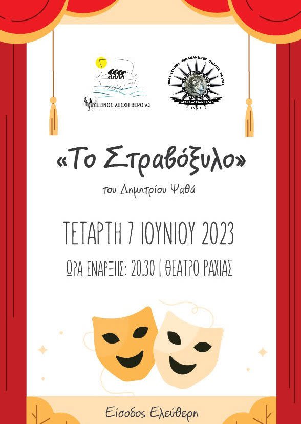Μετά τη μεγάλη επιτυχία που σημείωσε η παρουσίαση της θεατρικής παράστασης «Το στραβόξυλον», το Σάββατο 29 Απριλίου 2023, στο Χώρο Τεχνών του Δήμου Βέροιας και μετά από την επιθυμία πολλών συμπολιτών μας από όλο το Δήμο Βέροιας,