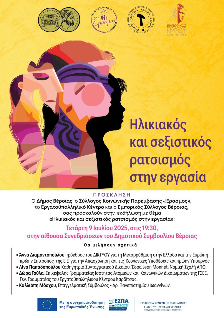 Ο Δήμος Βέροιας, ο Σύλλογος Κοινωνικής Παρέμβασης «Έρασμος», το Εργατοϋπαλληλικό Κέντρο και ο Εμπορικός Σύλλογος Βέροιας συνδιοργανώνουν εκδήλωση με θέμα «Ηλικιακός και σεξιστικός ρατσισμός στην εργασία», την Τετάρτη 9 Ιουλίου 2025, στις 7.30 το απόγευμα , στην αίθουσα Συνεδριάσεων του Δημοτικού Συμβουλίου Βέροιας.