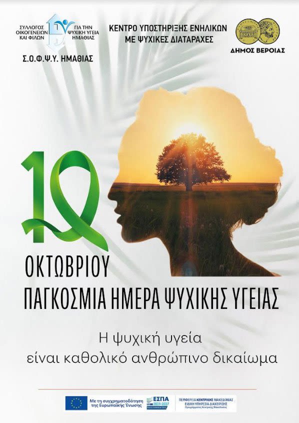 Εν όψει της Παγκόσμιας Ημέρας Ψυχικής Υγείας, η Κινητή Μονάδα Ψυχικής Υγείας Ενηλίκων Ημαθίας συνδιοργανώνει φέτος μαζί με το Κέντρο Υποστήριξης Ενηλίκων με ψυχικές διαταραχές του ΣΟΦΨΥ Ημαθίας μια ενημερωτική δράση για την Ψυχική Υγεία, με στόχο την ενημέρωση και ευαισθητοποίηση των πολιτών της Βέροιας στα ζητήματα Ψυχικής Υγείας, την καταπολέμηση του ψυχιατρικού στίγματος και την προώθηση της ψυχικής υγείας, ως προτεραιότητα για όλους. Η εκδήλωση θα γίνει την Τρίτη 10 Οκτωβρίου 2023 στο χώρο δίπλα στο Δημαρχείο της Βέροιας από τις 10:00 έως τις 13:30. Στην εκδήλωση θα συμμετέχουν επαγγελματίες ψυχικής υγείας της ΚΜΨΥ Ημαθίας και του ΣΟΦΨΥ Ημαθίας, οι οποίοι θα παρέχουν ενημέρωση στο κοινό.