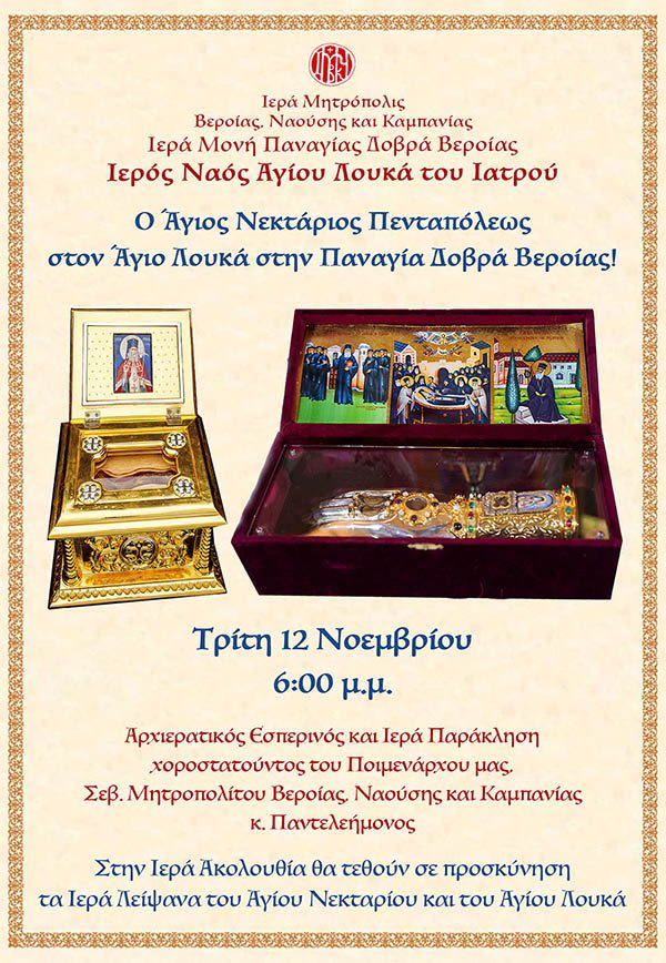 Μαζί με το χαριτόβρυτο Ιερό Λείψανο του Αγίου Λουκά του Ιατρού θα τεθεί σε προσκύνηση τεμάχιο του Ιερού Λειψάνου του Αγίου Νεκταρίου Πενταπόλεως.