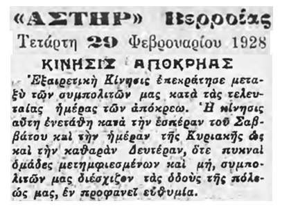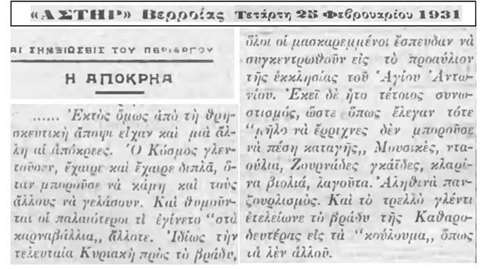 «Η Βέροια εφημίζετο πάντοτε για τα εξαιρετικά καρναβάλια που παρουσίαζε κάθε χρόνο τις αποκριές, ιδίως κατά τους χρόνους της δουλείας, στους οποίους οι Βεργιώτες ξεφάντωναν εις εθνικάς εκδηλώσεις μέχρι παρεξηγήσεως [δεν εννοεί κραιπάλη, αλλά εννοεί από τους κατακτητές Τούρκους, όπως θα δούμε σε άλλο του κείμενο]. Παρέες διάφορες ντυμένοι με την δοξασμένη του αρματολού φουστανέλα και τα επακόλουθα εξαρτήματα, πισλιά, τσαρούχια, σιάπκα, κάλτσες, βουδέτες και άφθονα ασημικά, περιέτρεχον την πόλιν χορεύουσαι και τραγουδούσαι Εθνικά άσματα.