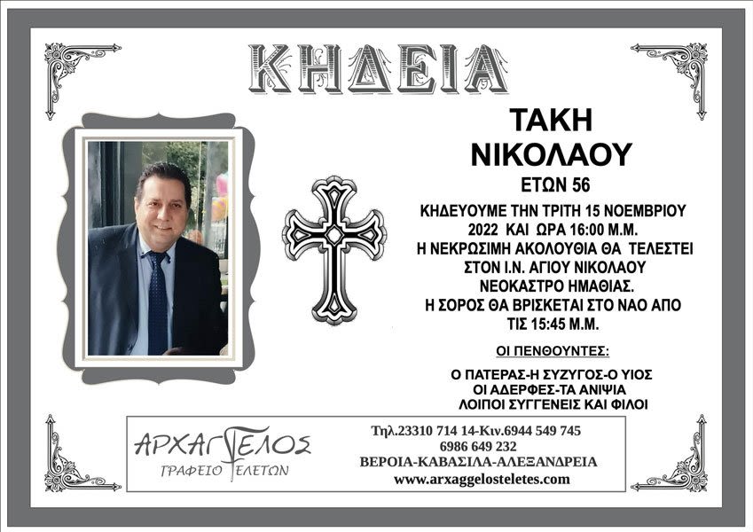 Η κηδεία του θα γίνει σήμερα Τρίτη 15 Νοεμβρίου στις 4:00 το απόγευμα από τον ιερό ναό Αγίου Νικολάου στο νεόκαστρο Ημαθίας.