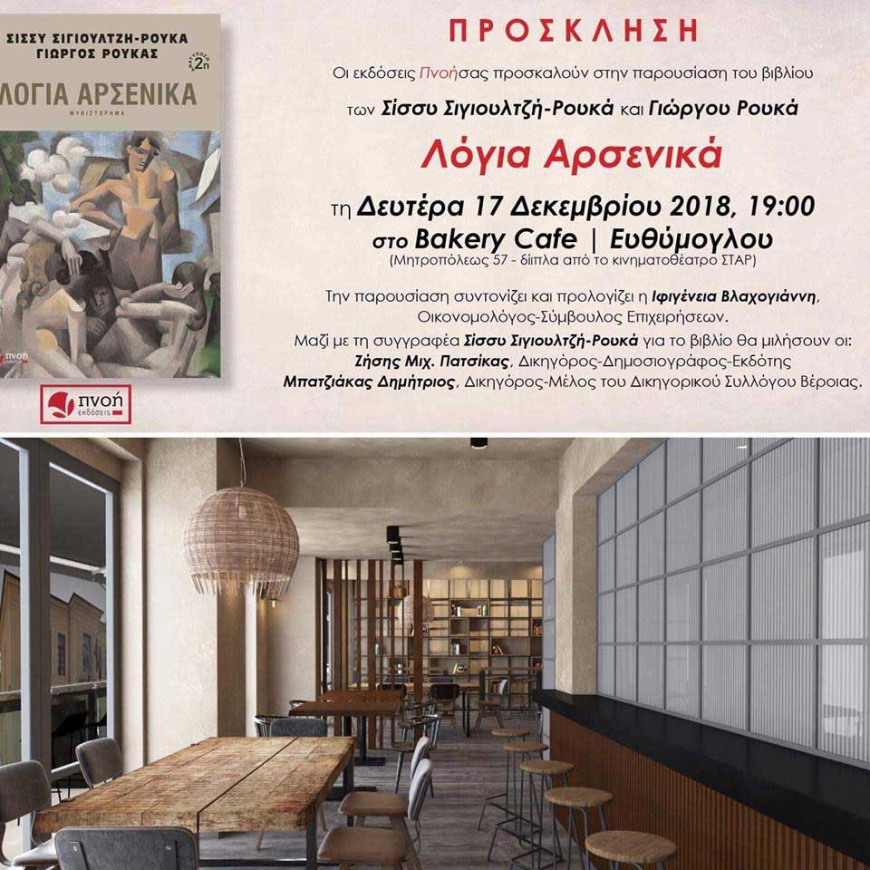 Το βιβλίο των Σίσσυ Σιγιουλτζή – Ρουκά και Γιώργου Ρουκά «Λόγια Αρσενικά», από τις εκδόσεις «Πνοή», παρουσιάζεται τη Δευτέρα 17 Δεκεμβρίου 2018, στις 7.00 μ.μ. στο Bakery Cafe /Ευθύμογλου (Μητροπόλεως 57 – δίπλα από το κινηματοθέατρο ΣΤΑΡ της Βέροιας).