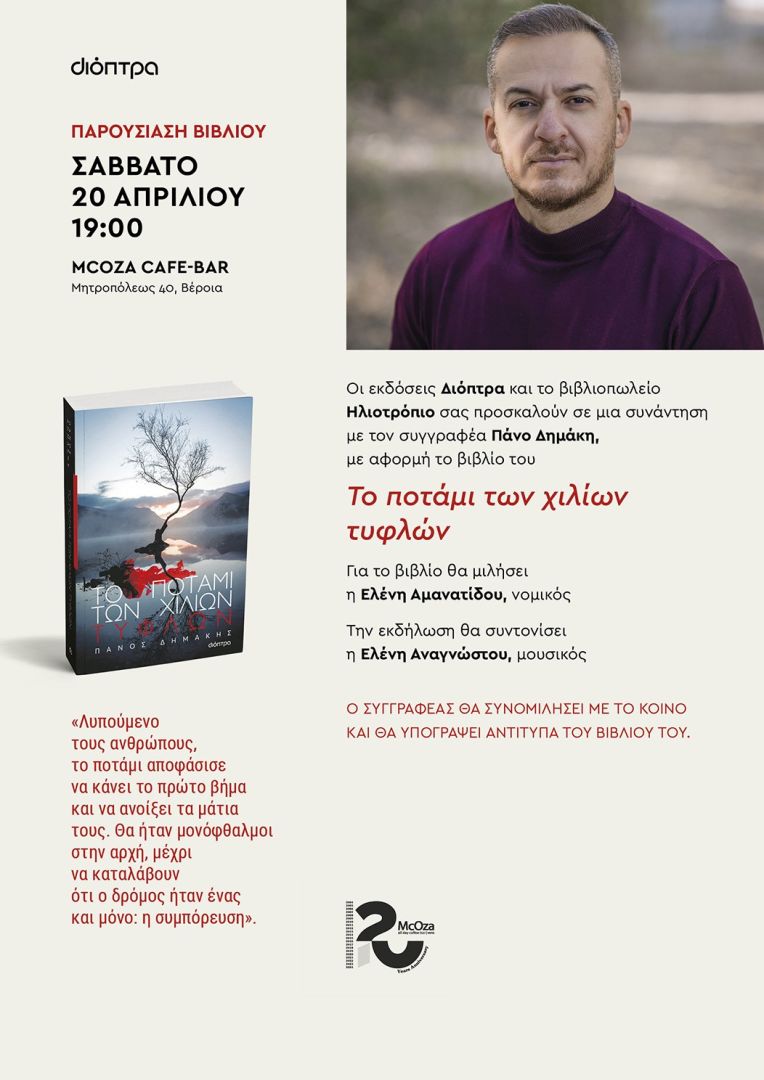 ποτάμι των χιλίων τυφλών» το Σάββατο 20 Απριλίου στις 7.00 μ.μ. στο café-bar MCOZA στην Βέροια.