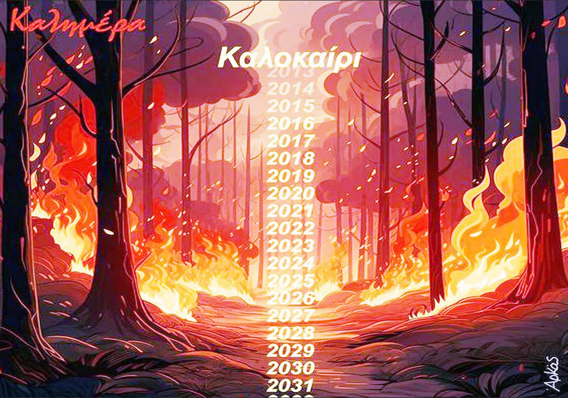 Μια «Καλημέρα» με φωτιές και καπνούς μας στέλνει ο δημοφιλής σκιτσογράφος Αρκάς μέσα από το νέο του επίκαιρο σκίτσο παρουσιάζοντας ένα δάσος να φλέγεται και παραθέτει τα έτη κατά τα οποία καταγράφηκαν μεγάλες φωτιές στην Ελλάδα, αλλά και τα επόμενα έτη. Το «καυστικό» σκίτσο δείχνει «εύγλωττα» ότι φετινές μεγάλες πυρκαγιές είναι συνέχεια των προηγούμενων, αλλά δυστυχώς αν δεν αλλάξει κάτι η χώρα κάθε χρόνο, κάθε καλοκαίρι θα ζει το ίδιο, αποπνικτικό και καταστροφικό σκηνικό
