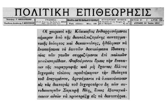 Ἐν τῷ ὑπὸ ἡμερομηνίαν 24 Ἰουλίου 1911 φύλλον τῆς «Πολιτικῆς Ἐπιθεωρήσεως» τοῦ κ. Μπούσιου[8], βουλευτοῦ Σερβίων, ἐνῷ ἀνεγίνωσκον ἓν ἐκ Θεσσαλονίκης ἀνταποκρίσει τὸ μέγα αδίκημα τῶν χωρικῶν τῆς παρὰ τὴν Βέρροιαν Κόκκοβας ὑπὸ τοῦ βέη αὐτῶν Σαμπρῆ, παραπλεύρως ἐν τῷ καφείῳ ἤκουσα διάλογον, συζήτησιν καὶ σχόλια ἐπὶ τοῦ αὐτοῦ θέματος μεταξὺ παρακαθημένων τινῶν ἐταστικὸν βλέμμα ῥίψας, ἀνεγνώρισα αὐτοὺς τοὺς ἰδίους χωρικοὺς Κοκκοβίτας ἐκ τῶν λόγων των καὶ ὡς ἦτο ἑπόμενον, ἐταστικώτερον ὕστερον προσβλέψας εἶδον τὰ πρόσωπα αὐτῶν κατηφῆ, κάτωχρα, μαραμμένα, ἐζωγραφισμένην ἐν τῷ βλέμματι ἔχοντα τὴν ψυχικὴν ἐκδήλωσιν τῆς ἀπελπισίας.
