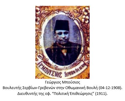 [8] Γεώργιος Μπούσιος (1875-1929), Βουλευτής Σερβίων-Γρεβενών στην Οθωμανική Βουλή του 1908, Βουλευτής Κοζάνης στο Ελληνικό Κοινοβούλιο (1915-Μάϊ., 1915-Δεκ., 1920, 1926), Υπουργός Εσωτερικών και Επισιτισμού (από 28-06-1922 έως 16-09-1922) στην Κυβέρνηση Νικολάου Τριανταφυλλάκου, Διευθυντής (1911) της ελληνικής εβδομαδιαίας εφημερίδας «Πολιτική Επιθεώρησις» της Κωνσταντινούπολης (ιδρυθείσας το 1910 από τον Ίωνα Δραγούμη).