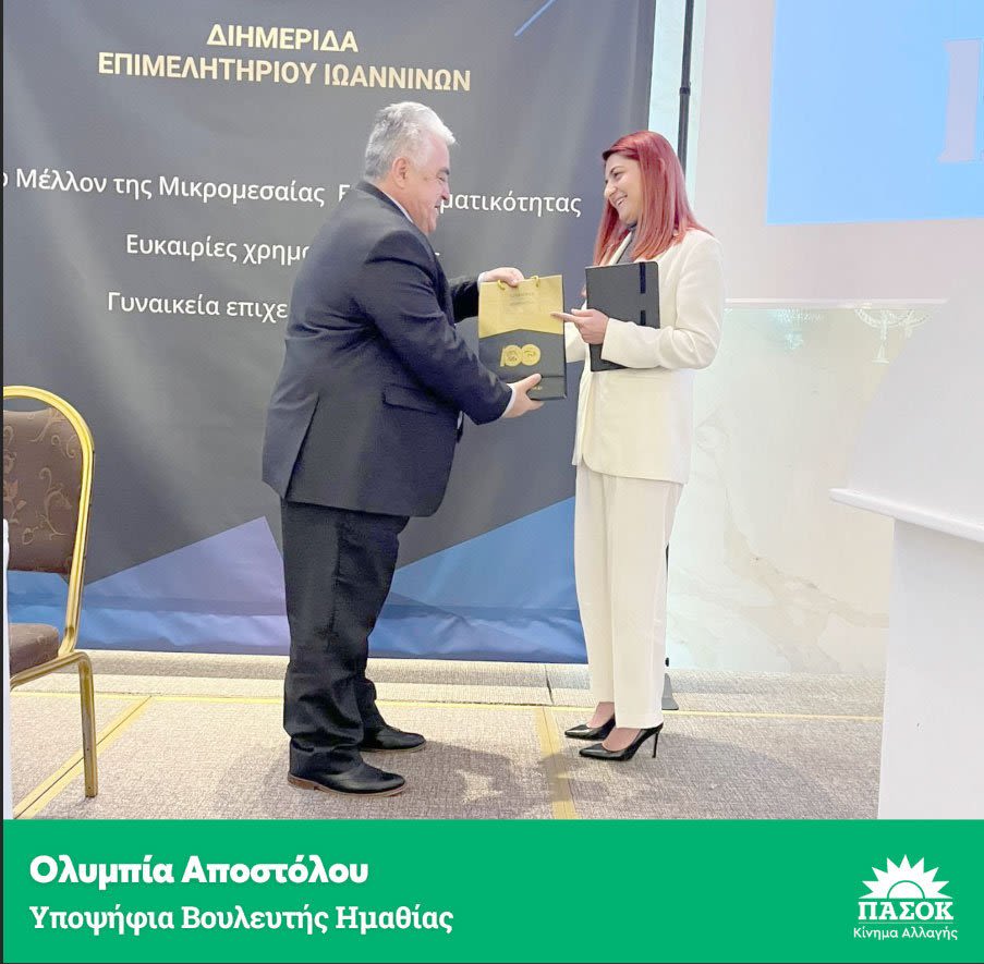 Η Ολυμπία Αποστόλου, μέλος του Πολιτικού Συμβουλίου του ΠΑ.ΣΟ.Κ. – Κίνημα Αλλαγής και υποψήφια βουλευτής Ημαθίας, εκπροσώπησε το Κίνημα σε Διημερίδα για τη Μικρομεσαία Επιχειρηματικότητα που διοργάνωσε το Επιμελητήριο Ιωαννίνων στις 7-8 Απριλίου. Ολυμπία Αποστόλου Υποψήφια Βουλευτής Ημαθίας ΠΑ.ΣΟ.Κ. – Κίνημα Αλλαγής