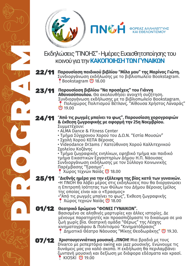 Η ΠΝΟΗ, με αφορμή την 25η Νοεμβρίου, διεθνή ημέρα για την εξάλειψη της βίας κατά των γυναικών, δημιούργησε ένα πλούσιο πρόγραμμα εκδηλώσεων διάρκειας δύο εβδομάδων με σκοπό την ευαισθητοποίηση των πολιτών πάνω σε ζητήματα κακοποίησης, αλλά και την ενημέρωσή τους για το έργο του Φορέα . Οι δράσεις σκοπό έχουν να θίξουν τα ζητήματα κακοποίησης, να δώσουν ένα ξεκάθαρο μήνυμα ενάντια σε κάθε μορφή βίας αλλά ταυτόχρονα να δώσουν κι ένα μήνυμα αισιοδοξίας αλλά και ενδυνάμωσης.