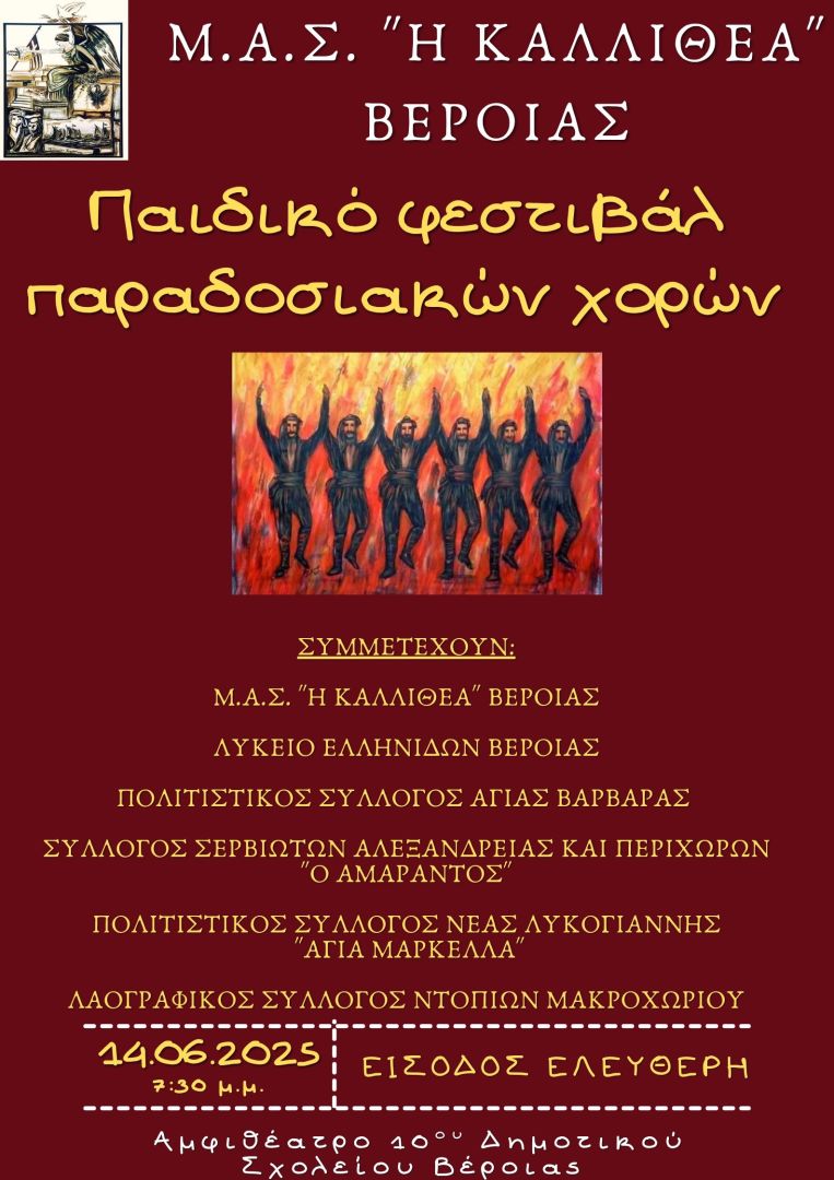 Το Σάββατο 14 Ιουνίου: 1ο παιδικό φεστιβάλ παραδοσιακών χορών από τον ΜΑΣ «Η Καλλιθέα» Βέροιας