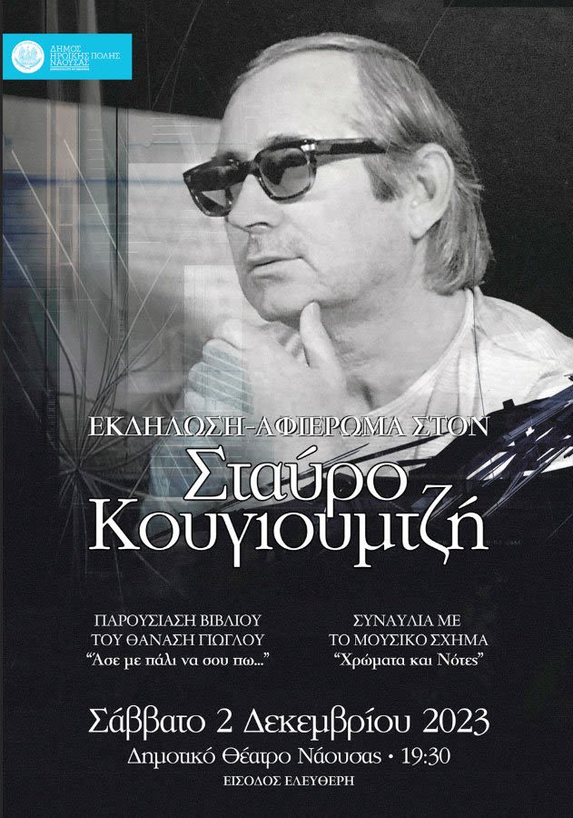 O Δήμος Ηρωικής Πόλης Νάουσας στο πλαίσιο των πολιτιστικών του δράσεων διοργανώνει το Σάββατο 2 Δεκεμβρίου 2023 και ώρα 19:30 στο Δημοτικό Θέατρο «Μίκης Θεοδωράκης» εκδήλωση – αφιέρωμα στον μεγάλο μουσικοσυνθέτη Σταύρο Κουγιουμτζή που έφυγε από τη ζωή το 2005 και άφησε ένα τεράστιο μουσικό έργο και σπουδαία τραγούδια.