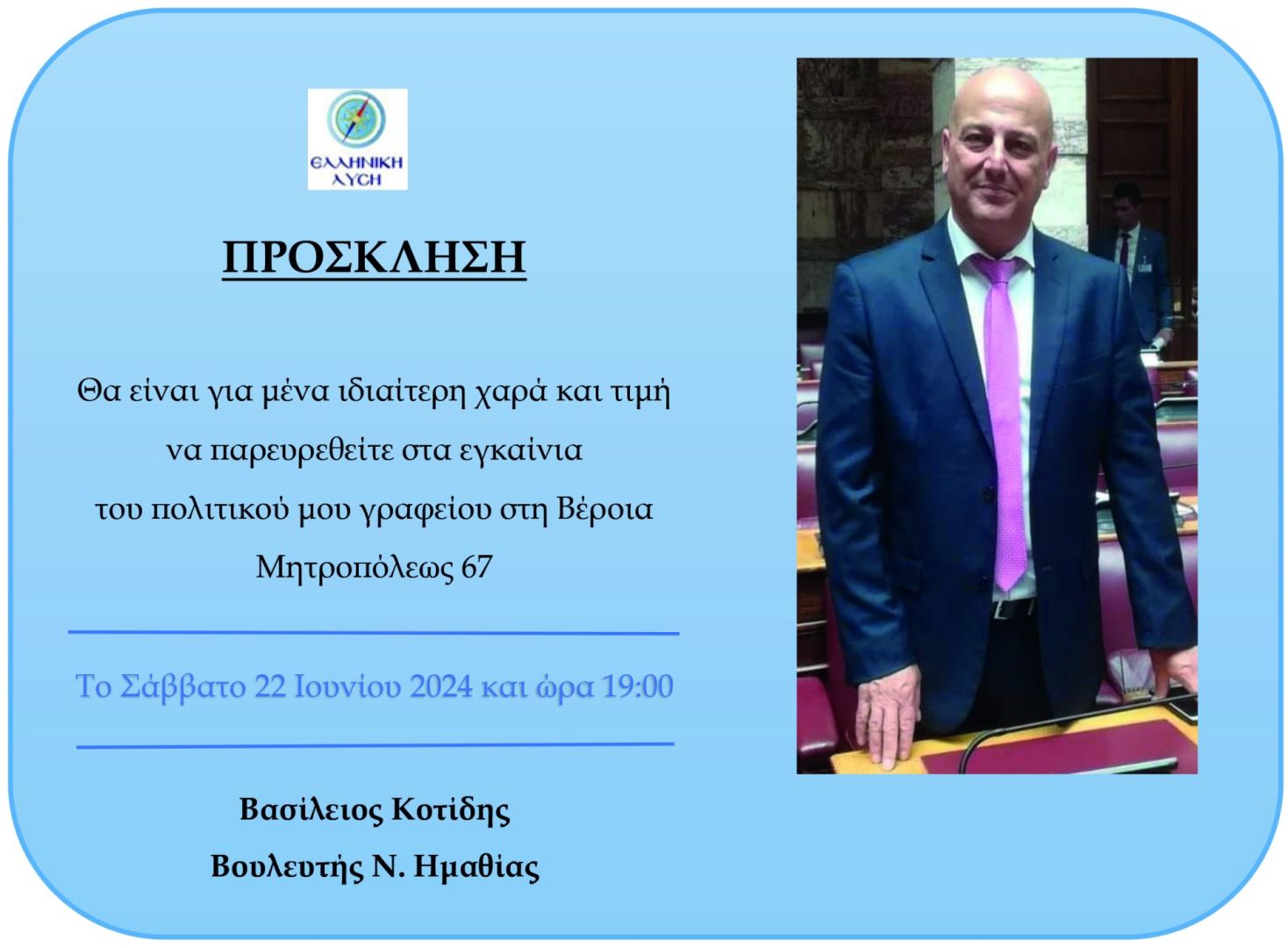 Το Σάββατο 22 Ιουνίου 2024 στις 7.00 μ.μ. Μητροπόλεως 67, θα πραγματοποιηθούν τα εγκαίνια του πολιτικού γραφείου του Βουλευτή Ημαθίας Βασίλη Κοτίδη.