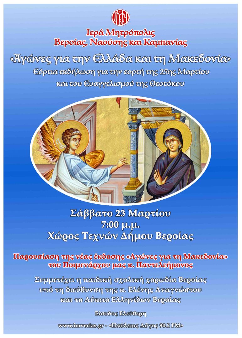 Η Ιερά Μητρόπολις Βεροίας, Ναούσης και Καμπανίας σας προσκαλεί στην εόρτια εκδήλωση για την εθνικοθρησκευτική εορτή της 25ης Μαρτίου που θα πραγματοποιηθεί το Σάββατο 23 Μαρτίου στις 7:00 μ.μ. στον Χώρο Τεχνών του Δήμου Βεροίας.